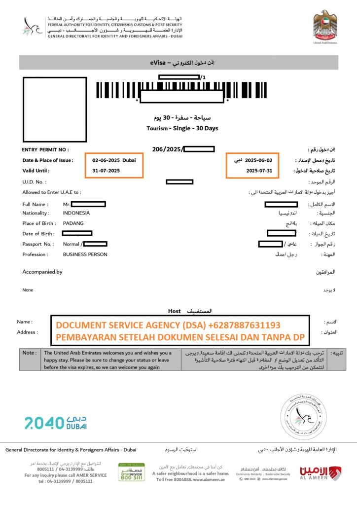 Document Service Agency (DSA) adalah spesialis jasa terjemah, legalisir, atestasi, apostile dokumen dan pengurusan visa terpercaya dan berpengalaman. Bagi anda yang ingin berkunjung ke Dubai/ UAE dalam rangka wisata atau liburan tidak perlu datang ke Jakarta untuk pengurusan visa atau dokumen lainnya, karena pengurusan visa bisa diwakilkan ke kami. Dengan layanan “Pembayaran Setelah Dokumen Selesai dan Tanpa DP” membuat anda nyaman dan aman menggunakan jasa kami. Dan Dalam hitungan beberapa hari dokumen anda selesai dan siap untuk digunakan.